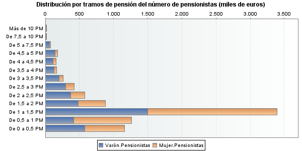 Pensionistas, percepciones de pensiones y pensiones medias por sexo y tramo de pensión