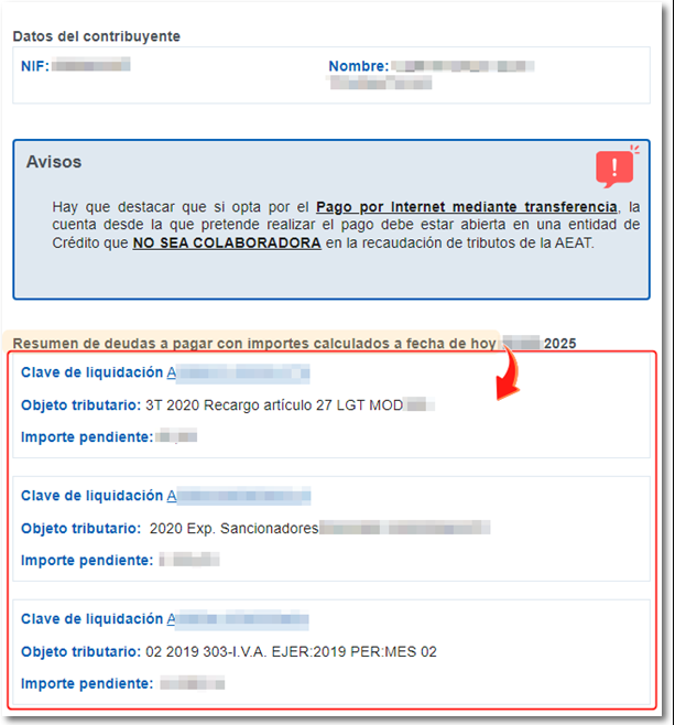 También puedes acceder a una clave de liquidación del listado para obtener más detalles y para realizar únicamente el pago de esa deuda.