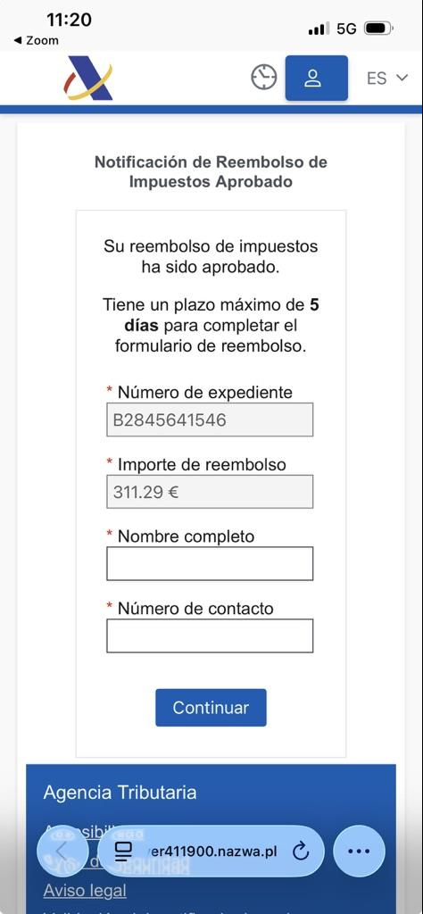 Se recibe un SMS que intenta suplantar la identidad de la Agencia Tributaria, con un enlace para acceder únicamente desde móvil o tablet, y que lleva a un formulario con una interfaz similar a la de la web de la AEAT en el que se muestra un supuesto número de expediente y un importe y se solicita el nombre completo y un número de contacto.