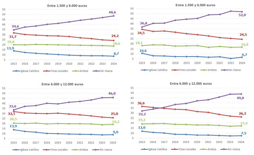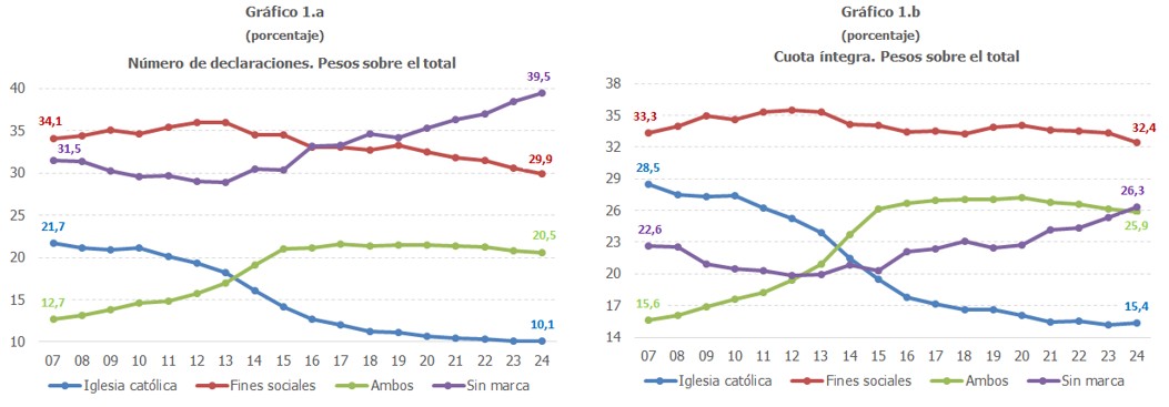 Por su parte, la asignación a la Iglesia Católica muestra una clara trayectoria decreciente a lo largo de todo el periodo, pasando de ser la segunda opción más elegida por los declarantes de IRPF en términos de cuota íntegra (la tercera en términos del número de declaraciones), con un peso del 28,5% sobre el total de la cuota en 2007, a ser la opción minoritaria (entre los ejercicios 2013 y 2015), situándose su peso sobre el total de la cuota íntegra en el 15,4% en 2024 y representado sólo un 10,1% del número de declaraciones. Una trayectoria contraria ha seguido la opción de marcar ambas casillas en la declaración, tanto desde la perspectiva del número de declaraciones como desde la del peso sobre la cuota íntegra. Esta alternativa empezó siendo la menos elegida en 2007, y fue ganando peso hasta el ejercicio 2020, año a partir del cual ha ido perdiendo relevancia de forma paulatina, a favor de la opción Sin marca.