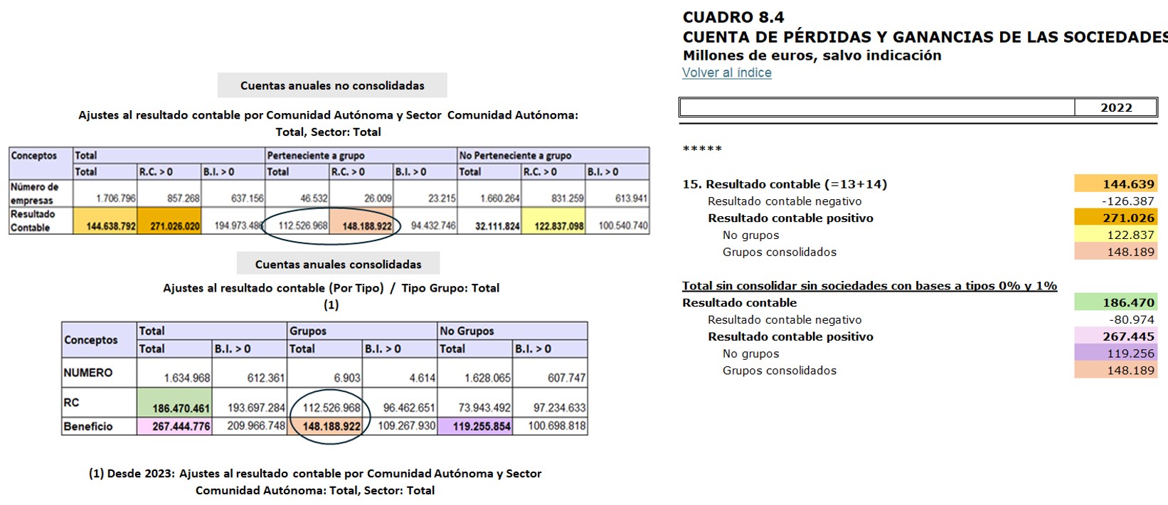 Desde la publicación del IART de 2024, el cuadro 8.4 incorpora un bloque en el que se recoge el resultado contable sin incluir a las sociedades con bases a tipos del 0% y 1%, que pasa a ser la partida inicial del Cuadro 8.5, donde se resume la liquidación del impuesto. La razón de este cambio (antes el cuadro 8.5 se iniciaba con el resultado contable positivo total) es el irregular comportamiento de los beneficios de las empresas con bases a tipos del 0% y 1%, casi todas ellas financieras (fondos de pensiones, sociedades de inversión, …), que están vinculados a la valoración de sus activos que, a su vez, depende de los cambios de tipos de interés y de las reacciones de los mercados financieros. Este hecho tiene mucha repercusión sobre la variación de los beneficios, pero apenas afectan al impuesto dada su escasa o nula tributación. La exclusión de estas sociedades aporta coherencia al análisis comparativo de la evolución de los beneficios y de la base imponible del impuesto, y es el criterio usado en la estadística Cuentas anuales consolidadas del Impuesto sobre Sociedades. Por su parte, el cuadro 8.5 muestra la liquidación del impuesto para los dos grupos relevantes, las empresas no pertenecientes a grupos y los grupos consolidados, integrando la información de los modelos 200 y 220.
