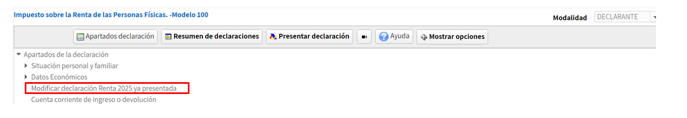 Una vez realizadas las modificaciones en la declaración, en "Apartados declaración" seleccionará la opción " Modificar declaración Renta 2025 ya presentada":