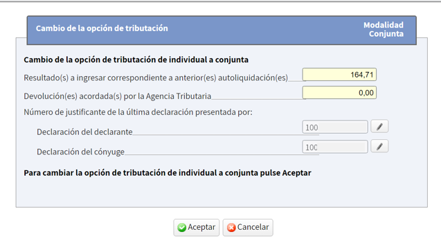 En el cambio de opción de tributación de individual a conjunta con carácter general no se tiene que cumplimentar ningún importe de forma manual pues trae de forma automática los números de justificantes, los ingresos previos (sólo se computarán los ingresos ya efectivamente realizados) y las devoluciones ya acordadas. Por tanto, no se computan las solicitadas por el contribuyente que no hayan sido acordadas por la AEAT.