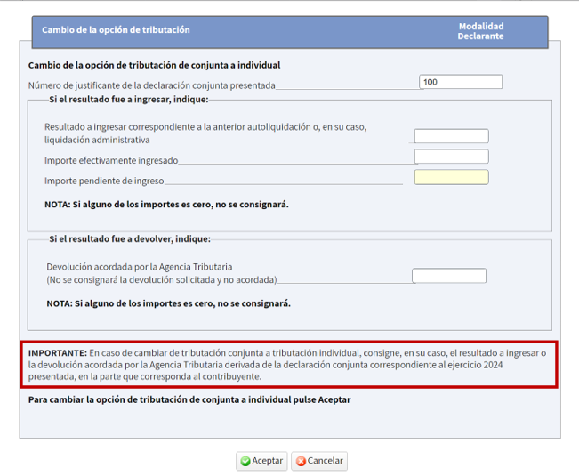 En el cambio de opción de conjunta a individual, los importes han de ser cumplimentados manualmente, por lo que las casillas aparecerán vacías: